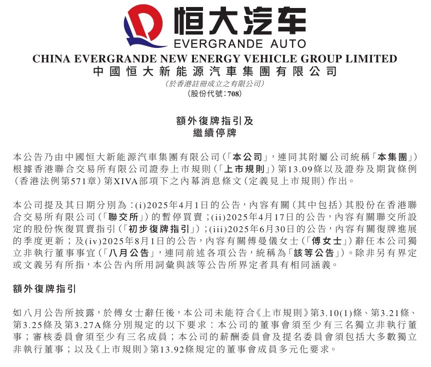 8月7日晚间,恒大汽车公告,因公司未能满意香港联交所上市规则要求,需遵照增补复牌指引。