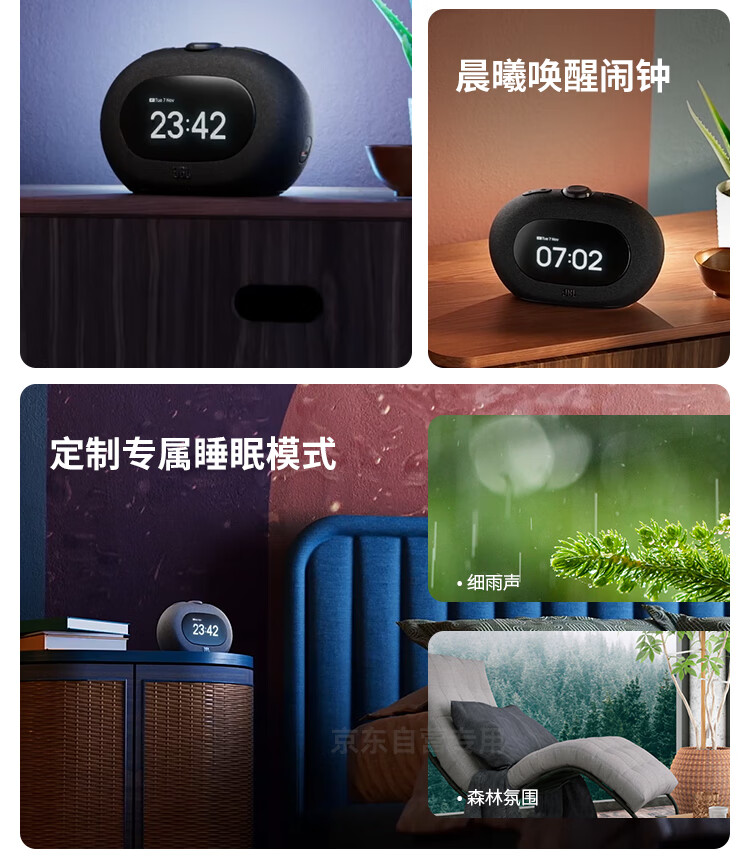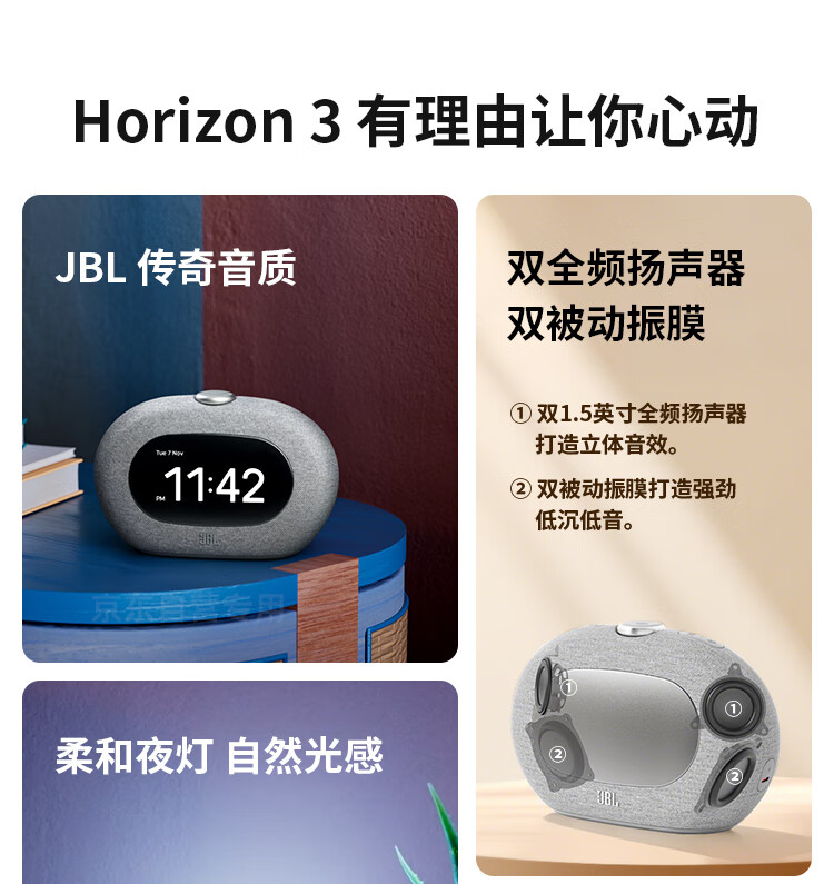 其内置双 1.5 英寸全频扬声器、双被动振膜,机身配备柔和夜灯,可通过 JBL O ...