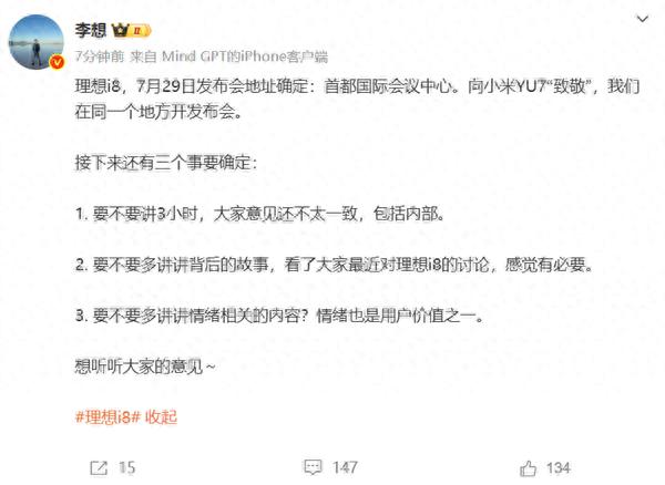 站长之家(ChinaZ.com)7月18日 消息:克日,抱负汽车CEO李想在交际平台发文透露,抱负i8新车发布会将于7月29日在都城国际集会中央举行,并特殊表现此次发布会将“向小米YU7致敬”,缘故原由是二 ...