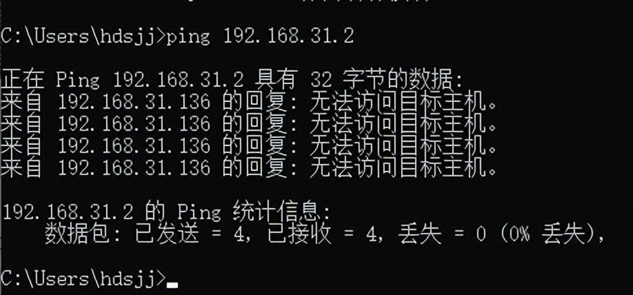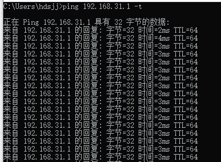 输入ping 192.168.31.1 -t 此处地点为我本机网关,如下图,表现网络正常。