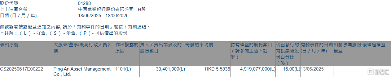 格隆汇6月18日丨根据联交所最新权益披露资料表现,2025年6月13日,农业银行(6.190, -0.03, -0.48%)(01288.HK)获Ping An Asset Management Co., Ltd.在场内以每股均价5.5836港元增持3340.1万股, ...