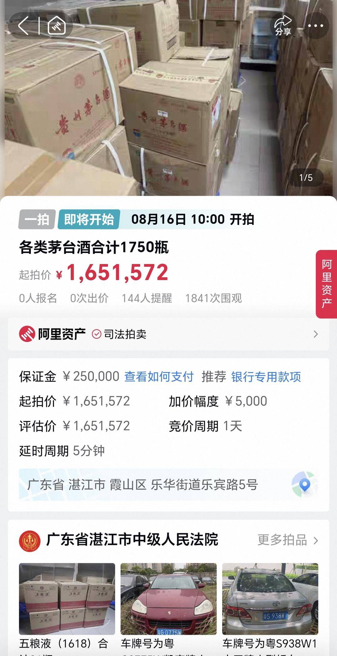 8月7日,红星消息记者从阿里司法拍卖平台留意到,8月16日上午,广东省湛江市中级人民法院将在司法拍卖平台对1750瓶各类茅台酒举行拍卖,起拍价1651572元。