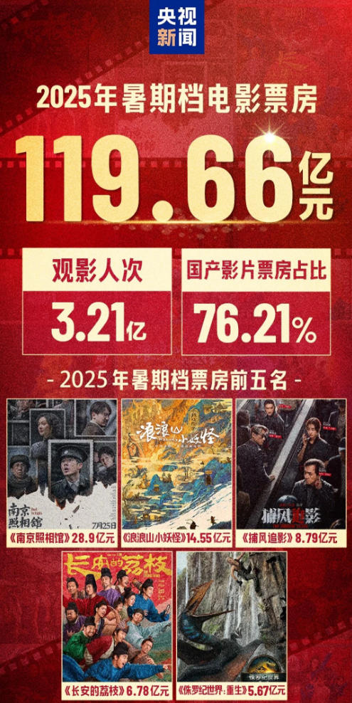 根据国家影戏局统计,2025年暑期档(6月1日至8月31日)影戏票房为119.66亿元,观影人次为3.21亿,同比分别增长2.76%和12.75%,国产影片票房占比为76.21%,凌驾客岁同档期。