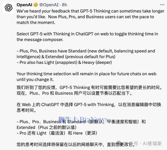 9月18日消息,OpenAI本日公布针对GPT-5的“思索时长”功能推出庞大升级——克日起,ChatGPT网页版的Plus、Pro及Business付费用户可根据场景需求,自主调治GPT-5模子的思索时间。