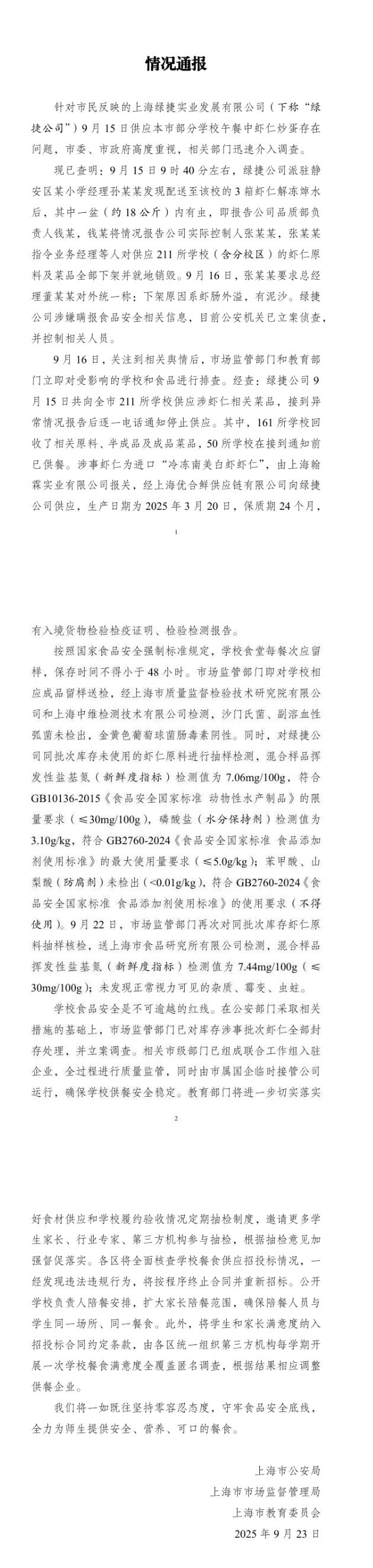 9月23日,记者获悉,针对市民反映的上海绿捷实业发展有限公司(下称“绿捷公司”)9月15日供应上海市部门学校午餐中虾仁炒蛋存在题目,相干部分参与观察,上海市公安局、上海市市场监视管理局 ...
