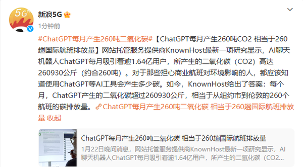 陈诉称ChatGPT每月产生260吨二氧化碳 耗电量也在大增 【CNMO科技消息】克日,网站托管服务提供商KnownHost发布的一项研究表现,AI谈天呆板人ChatGPT每月的二氧化碳排放量高达260吨,这相称于从纽约市到伦敦的260个航班的碳排放量。 ![]() ChatGPT作为当前最受接待的AI谈天呆板人之一,每月吸引着凌驾1.64亿用户。然而,其巨大的用户量也带来了不可忽视的碳排放题目。KnownHost的研究指出,只管ChatGPT每次页面欣赏产生的二氧化碳量相对较少,但由于其巨大的用户底子,团体碳排放量仍旧非常惊人。 别的,研究还发现,其他AI工具的碳排放量也不容小觑。比方,AI写作工具Rytr和条约草拟工具Spellbook固然每次页面欣赏产生的二氧化碳量高于ChatGPT,但由于其用户量较少,团体碳排放量相对较低。然而,随着AI技能的不停遍及和应用,这些工具的碳排放量也有望进一步增长。 值得留意的是,ChatGPT等AI应用步伐的托管数据中央也必要大量的能源支持。伯克利实行室的陈诉指出,从2017年到2023年,美国数据中央的能源需求已经翻了一番多,而这种增长趋势预计还将连续。 ![]() 面临这一题目,KnownHost首席实行官Daniel Pearson夸大,能源服从在AI底子办法中的紧张性不容忽视。他号令科技公司和AI工具用户均衡情况可连续性,将环保作为焦点关注点。同时,拜登当局也提出了数据中央能耗的办理方案,鼓励利用干净能源来运营数据中央。 版权全部,未经允许不得转载 (本文来自于手机中国) |