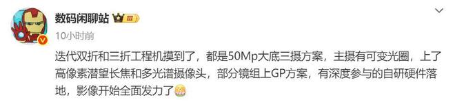 据博主@数码闲聊站 最新爆料,某厂迭代双折和三折工程机均接纳 50Mp 大底三摄方案,配备可变光圈主摄 + 高像素潜望长焦 + 多光谱摄像头,部门镜组上 GP 方案,有深度到场的自研硬件落地。 联合批评区讨论及产物迭代环境来看,该厂预计指华为。