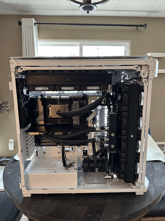 这台电脑最初于2024年底完成组装,在无机箱状态下测试时运行稳定。随后,他将整套硬件安装至Corsair 9000D Super Full-Tower机箱内,依然没有异常表现。