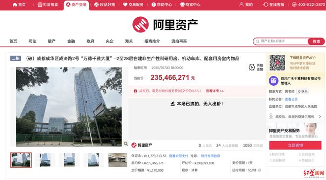 微成都报道7月2日起,位于成都市成华区成济路2号的万德千雅大厦,以2.35亿元的价格拍卖。7月3日上午10时,因无人出价该标的流拍。 微成都注意到,该物业曾于6月4日首次拍卖,当时起拍价为2.62亿元,同样因无人出价而流拍。