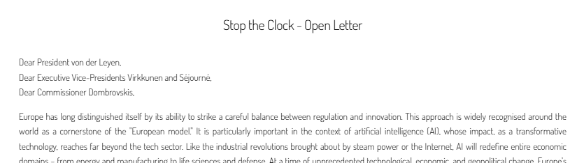 在东方财产看资讯行情,选东方财产证券一站式开户生意业务 近50家欧洲企业公开号令欧盟停息实行其《人工智能法案》,来由是该法规大概危及该地域在人工智能(AI)范畴的雄心。 商界首脑们致信欧盟委员会主席冯德莱恩等欧盟官员,要求推迟实行对AI模子举行羁系规定的时间,并号令接纳另一种更加“有利于创新”的羁系方式。 ![]() 这封公开信发布在“欧盟人工智能冠军倡议”网站上,落款中有靠近50个欧洲企业的高管,包罗空客、阿斯麦、罗氏、梅赛德斯-疾驰等,以及Mistral、ElevenLabs等AI公司。 联名信中写道,在AI的大配景下,可否在羁系与创新之间取得审慎均衡这一点尤为紧张,“遗憾的是,这种均衡现在正因欧盟法规不明白、相互重叠且日益复杂而受到粉碎。” “这不但危及欧洲领军企业的发展,也危及各行各业在环球竞争所需规模上摆设人工智能的本领,使欧洲的人工智能雄心面对风险。” 公开信指出,即将出台的数字综合方案和数字康健查抄,必须表现出朝着更平衡、更有利于创新的羁系方式迈进的刻意。 “在此配景下,昨们接待近期关于推迟《人工智能法案》实行的讨论,由于相干指南和尺度仍在不停订定中,各行各业也在共同积极探求得当全部人的办理方案。” 公开信夸大,“为了应对这种环境造成的不确定性,昨们敦促欧委会在关键任务见效前对《人工智能法案》举行为期两年的‘停息’,以便企业公道实行,并进一步简化新规则。” 信中写道,假如欧盟能推迟实行,再加大将羁系质量优先于速率的答应,将向环球创新者和投资者发出猛烈信号,表明欧洲在推进简政放权与加强竞争力方面是认真的。 客岁8月,欧盟《人工智能法案》正式见效。其时法案规定,《通用人工智能举动准则》应于2025年5月1日前预备停当。现在该准则的落实已耽误,并受到广泛品评。 法案本来规定,功能最强盛的模子需接纳额外步伐以低落风险、加强安全性,并陈诉其体系架构相干信息。别的,该法案还对某些利用场景设置了限定。 这意味着,根据欧盟设定的时间表,像OpenAI最强盛的AI模子应在8月前到达合规要求。然而停止7月,由AI开辟者、学者等构成的委员会仍在就详细的指南举行猛烈讨论。 只管举动准则属于志愿性子,但它为企业合规提供了框架。违背相干规定大概碰面临最高相称于公司年收入7%的罚款;对于开辟先辈AI模子的公司来说,这一比例是3%。 多家科技公司已责怪举动准则的草案内容超出了《AI法案》的范围,因其设置了更为繁复的要求。财联社先前报道提到,4月时连美国当局也已经参与,施压欧方放弃举动准则。 本年2月,Meta首席环球事件官乔尔·卡普兰(Joel Kaplan)在布鲁塞尔一场线上运动中称该举动准则“不可操纵、无法实行”,并表现公司不会签订其现行版本。 Alphabet也对该规则提出品评,公司一位高管称,关于要求举行第三方模子测试和版权掩护的准则过于严酷。