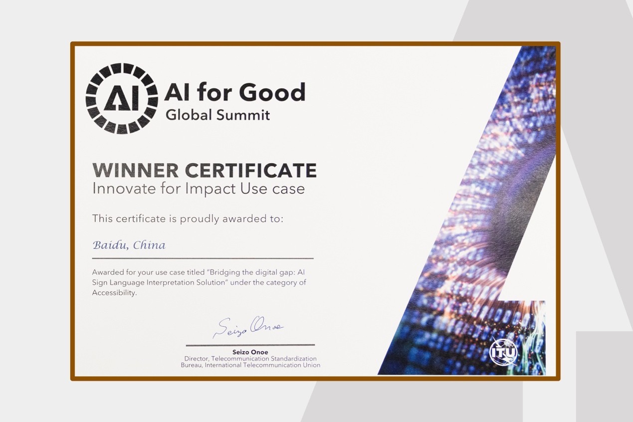 7月8日至11日,由团结国国际电信同盟(ITU)携手47家团结国同伴机构共同举行的2025人工智能向善环球峰会在瑞士日内瓦召开。峰会期间,ITU正式发布“人工智能向善:创新扩大影响案例集”(AI for Good - Innovate for Impact Report),此中“百度智能云AI手语数字人”乐成入选本次案例集,并荣获良好案例奖,为听障群体的信息无停滞通道建立提供了高效、可推广的创新路径。