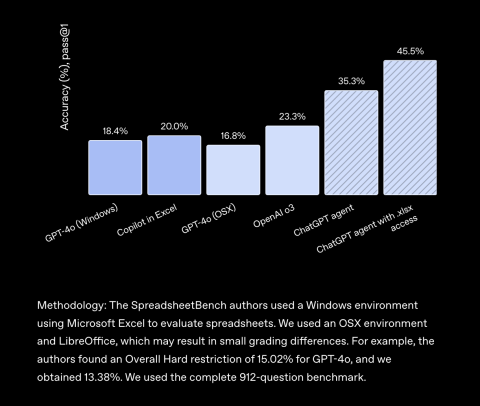(图:评测方法:SpreadsheetBench的作者在Windows 情况下利用 Microsoft Excel 对电子表格举行评估。昨们则在 OSX 情况中利用 LibreOffice,这大概导致评分出现稍微差别。比方,作者陈诉 GPT‑4o 在团体 Hard 限定上的效果为 15.02%,而昨们得到 13.38%。昨们利用了完备的 912 道标题基准测试。) 根据ChatGPT Agent本身做的PPT,在做PPT的本领上和上网冲浪本领上,Agent的本领都相比纯粹的底子模子有较显着的提拔。但离人类还颇有间隔。