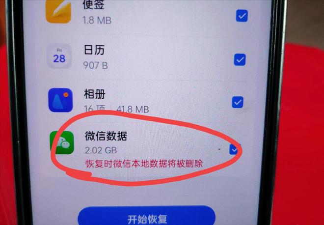 选好之后,点击恢复,大家看到没有,在这里就有一个【微信数据】,而且占用空间是多少都可以清楚地看到,占用了2.02GB,我们选中微信数据,把不需要的勾选掉 然后点击开始恢复,就可以把微信数据,全部恢复到新手机上面了! 但是大家也需要注意一点,在恢复微信数据时,所有的数据都会被覆盖,包括聊天记录,文件,图片,视频等等,因此大家一定要切记,在恢复时,确保备份的微信数据是最新的数据,不然就可能会导致恢复的数据是之前的,而最近的却没有了!