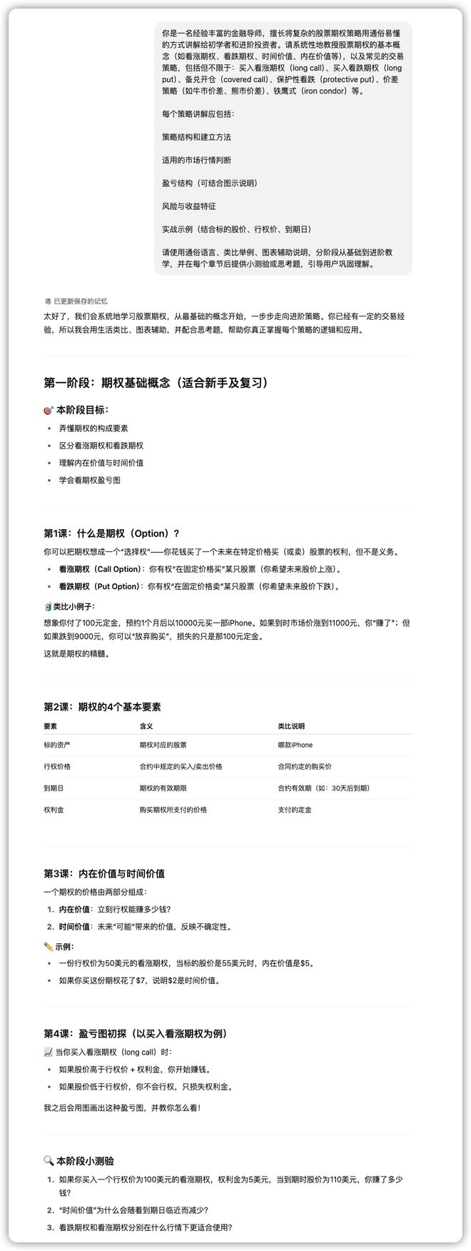 简而言之,在这一模式下,ChatGPT不会直接给出答案,而是通过联合苏格拉底式提问、引导性提示和自我反思的互动方式,引导利用者深入思索题目本质。这一功能还能根据用户的知识程度量身定制学习路径,并提供测试题以巩固明白。 只管OpenAI表现该功能重要面向大门生群体,但由于大模子自己具备强盛的通识本领,其讲授范围远不止于此。除了官方示例中给出的博弈论、管帐学、物理和数学概念的讲授外,ChatGPT能“教”的内容极其广泛——比方怎样炒股。 比方,在“体系学习股票期权”的哀求下,ChatGPT能在短短数秒内天生一套期权入门课程。涵盖概念表明、举例和训练。
