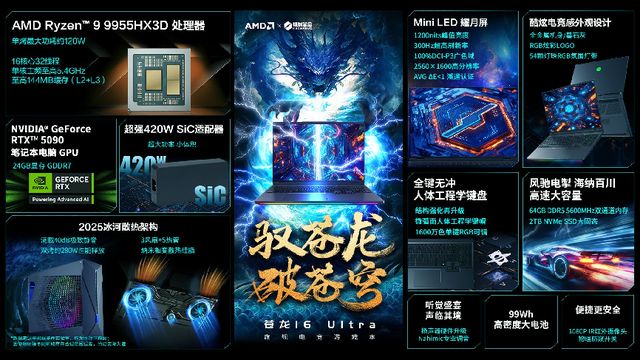 最具代表性的旗舰机型为苍龙16 Ultra游戏本,ACD三面铝合金机身实现旗舰级质感与做工,在水冷散热加持下可提供惊人的性能释放。借由搭载3D V-Cache缓存的锐龙9 9955HX3D处理器,为玩家带来更高更稳定游戏帧数。GeForce RTX 5090笔记本电脑GPU让玩家畅游更逼真更高帧率的游戏世界。