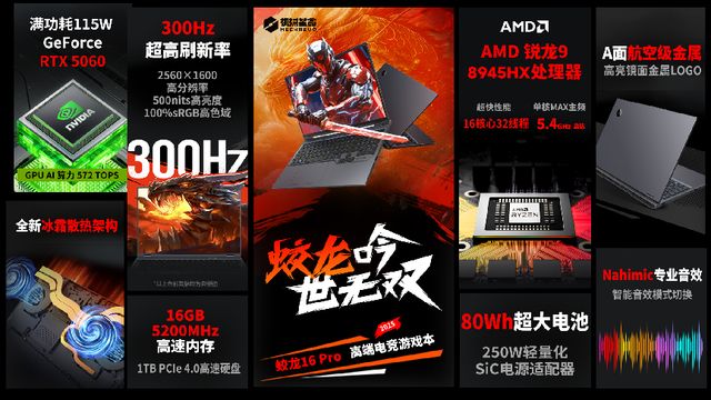 除了旗舰机型称霸全场外,针对高端玩家而生的蛟龙16 Pro游戏本也获得了广大玩家们的认可。前卫且低调奢华的外观设计让蛟龙16 Pro成为主流游戏本的代名词。旗舰级锐龙9处理器与GeForce RTX 5060显卡的强强组合让这台游戏本不仅能够成为电竞利器,还可胜任复杂的生产力应用。 玩家定义标准,体验驱动进化