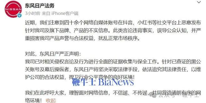 用户可通过天然语言提问,AI即时天生图文联合的购物清单、代价对比以及发起等,现在重要偏重在购物攻略、口碑评测等方面。 7、东风日产:遭四十多个自媒体账号造谣,已全面网络保全证据 8月19日,东风日产法务部发文称,近期留意到四十余个网络自媒体账号在抖音、小红书等交际平台上恶意发布针对该公司及旗下品牌、产物的不实信息。 东风日产称,此类言论违反究竟,误导公众认知,并严峻侵害其产物荣誉与正当权益,扰乱正常市场秩序。 对此,东风日产严正声明:我司已对相干侵权言论及举动举行全面的证据网络与保全工作。针对已查证的黑公关账号及幕后利用者,东风日产将果断接纳法律本领,依法追究其法律责任,以维护公司的正当权益,保卫行业公平竞争的精良情况!