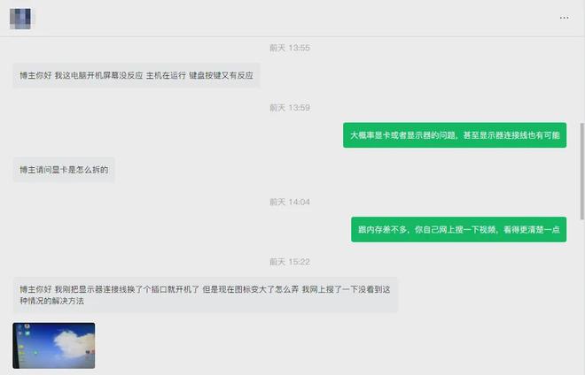 关于人,我想说,真的就是社会百态,什么样的都有。有凌晨5点遇上问题,在后台留言询问,我没回复之后爆粗口的。也有读了文章之后,觉得我写的内容跟自己的认知,或者想象不一样,就来反驳的。甚至有自己看的时候不仔细,看错了,反过来质问我的。还有想叫我帮忙写一个配置,但是说话语气理直气壮,一副领导给员工下达指令的感觉。 我想说,我在网上分享这些内容,以及帮粉丝解决电脑故障,写配置,都是免费的,没问粉丝要过一分钱。但是,我也是个人,要养家糊口,有自己的事情要干,不可能每天24小时在线,等给你免费服务。即便你是大老板,是什么高级领导,但是我不是你的下属,不是你手底下的员工,你请我帮忙,不应该是下达命令的态度吧。 当然,我的吐槽也只是针对极个别的人,大多数粉丝还是非常文明,非常有礼的。 今天跟大家分享一位粉丝在后台关于电脑故障的咨询,以及我指导维修的过程和结果。