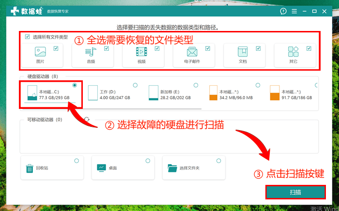 秘籍四、数据蛙恢复专家找回电脑硬盘坏了丢失的数据我不同意,Windows File Recovery也能算恢复软件?想要更加直观、使用起来更加简单方便的数据恢复软件,数据蛙恢复专家当仁不让。电脑硬盘坏了怎么恢复数据? 不少用户可能还觉得硬盘坏了这么严重的问题,恢复软件还能派上用场吗?其实,借助数据蛙恢复专家超强的深度扫描功能,许多数据都能重见天日。而且这款数据恢复软件不仅支持Windows系统,你还可以通过Mac系统下载和使用,是不是非常惊喜呢? 第一步:通过官网,你可以安全快速地将数据蛙恢复专家下载到电脑中。运行软件,接下来需要我们操作的核心步骤是选择扫描的文件类型和丢失路径,我们可以全选文件类型,然后选择故障的硬盘。