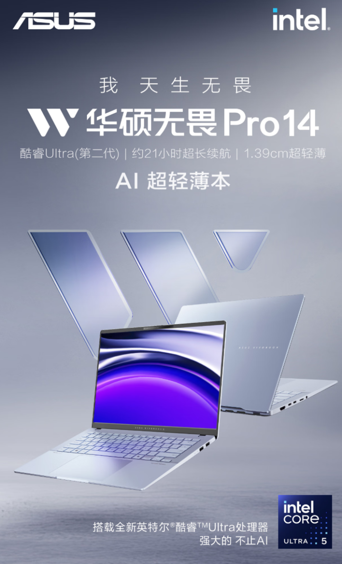 要是你总在外面跑,对续航要求特别高,那华硕无畏Pro14(搭载酷睿Ultra200V 处理器)绝对是最佳选择—— 续航能飙到 21小时,外出一天回宿舍还有电。